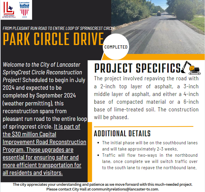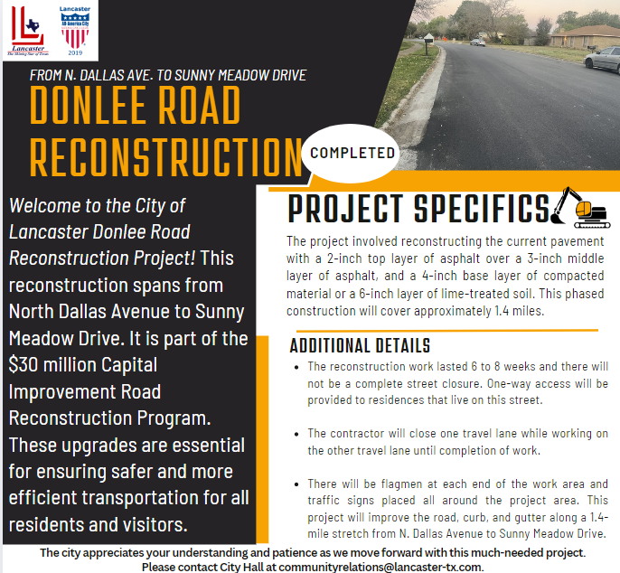 November 2023, the City of Lancaster City Council approved a multi-million dollar budget dedicated to addressing the city's road infrastructure needs. As part of this initiative, city staff submitted Requests for Proposals (RFPs) to obtain bids for the reconstruction of several asphalt and concrete streets throughout the city. After a thorough review of the proposals, construction vendors were selected, and the reconstruction process has commenced.