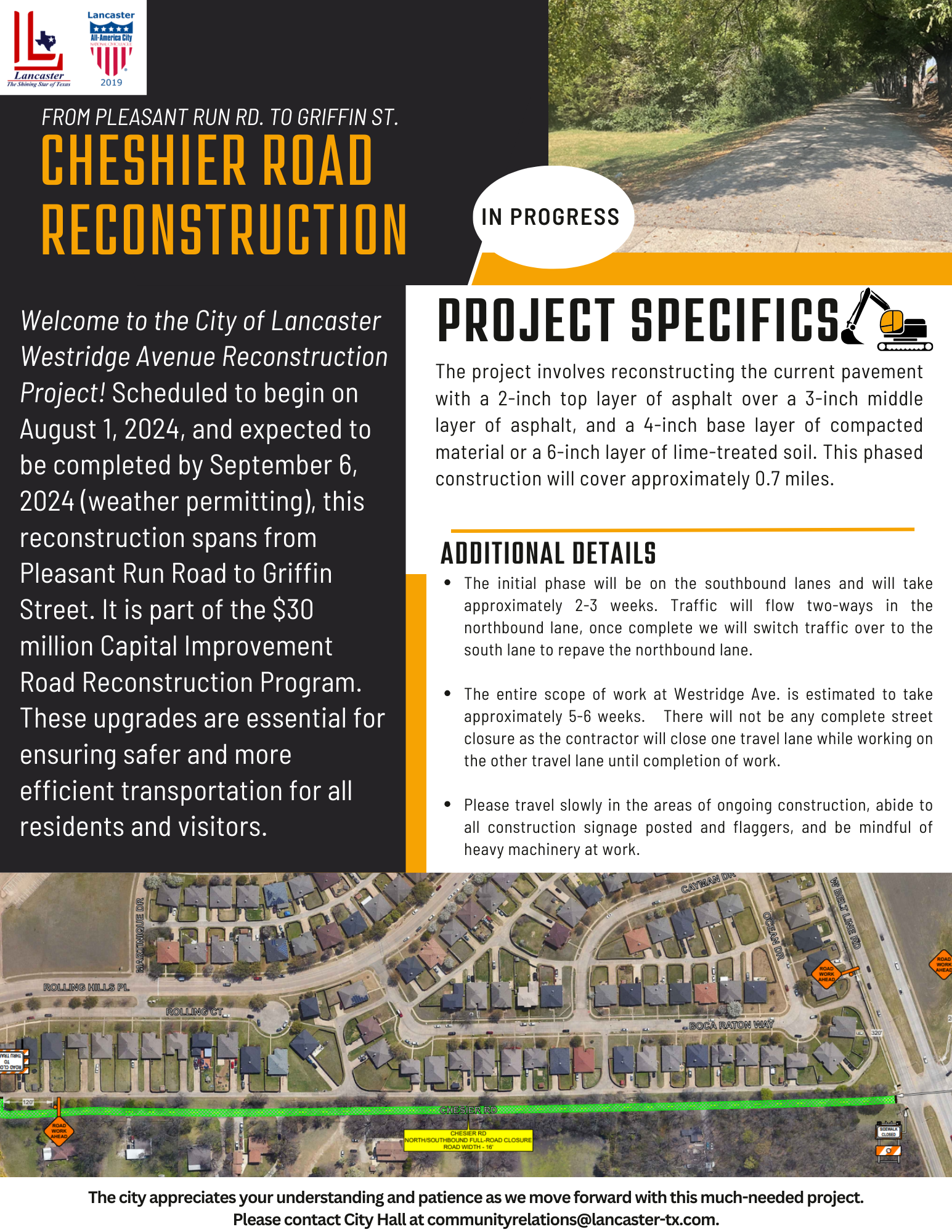 November 2023, the City of Lancaster City Council approved a multi-million dollar budget dedicated to addressing the city's road infrastructure needs. As part of this initiative, city staff submitted Requests for Proposals (RFPs) to obtain bids for the reconstruction of several asphalt and concrete streets throughout the city. After a thorough review of the proposals, construction vendors were selected, and the reconstruction process has commenced.